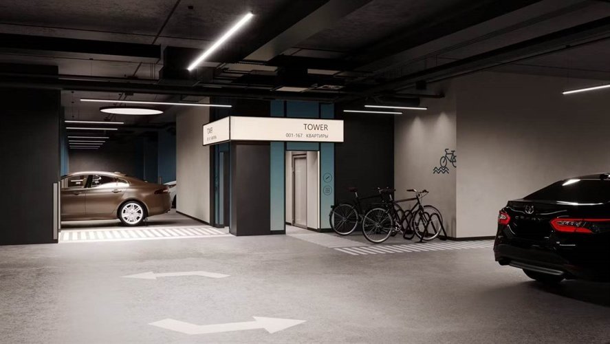 Подземный паркинг предлагает места для автомобилей, мотоциклов и велосипедов. Прилегающая набережная будет благоустроена для прогулок и отдыха у реки, создавая идеальное место для расслабления.