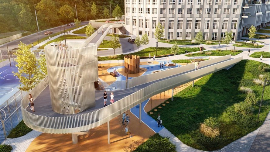 В каждом подъезде предусмотрены просторные колясочные для хранения колясок, велосипедов и самокатов, а также места для мытья колес и лап животных. Лобби комплекса оформлено в сдержанных тонах с витражными окнами, создающими ощущение простора.
